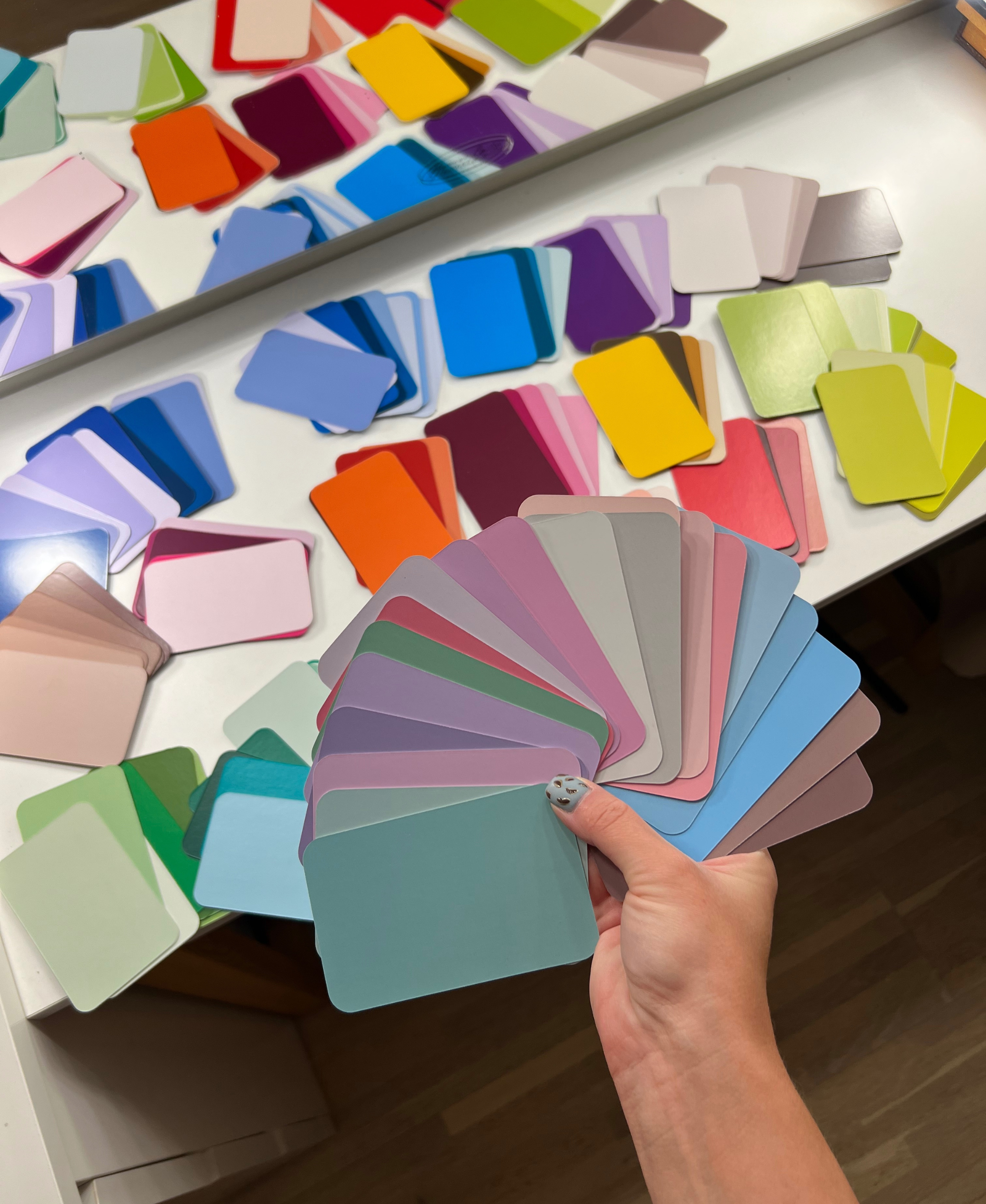 Karnet zawiera 25-40 kolorów, który wspólnie układamy na konsultacji i zabierasz go ze sobą. Możesz także zamówić taki karnet w dowolnej chwili lub po analizie kolorystycznej online. Wysyłam go wtedy paczkomatem.